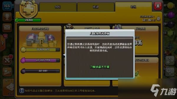在部落冲突手游中,这个月所有进攻别人得到的资源(金币、圣水、黑油等)都会按相同数量存入月度挑战资源箱,等到挑战结束(为期一个月),月度挑战资源箱的资源就会自动存入家乡资源仓库。上限最高2500w金币和圣水。